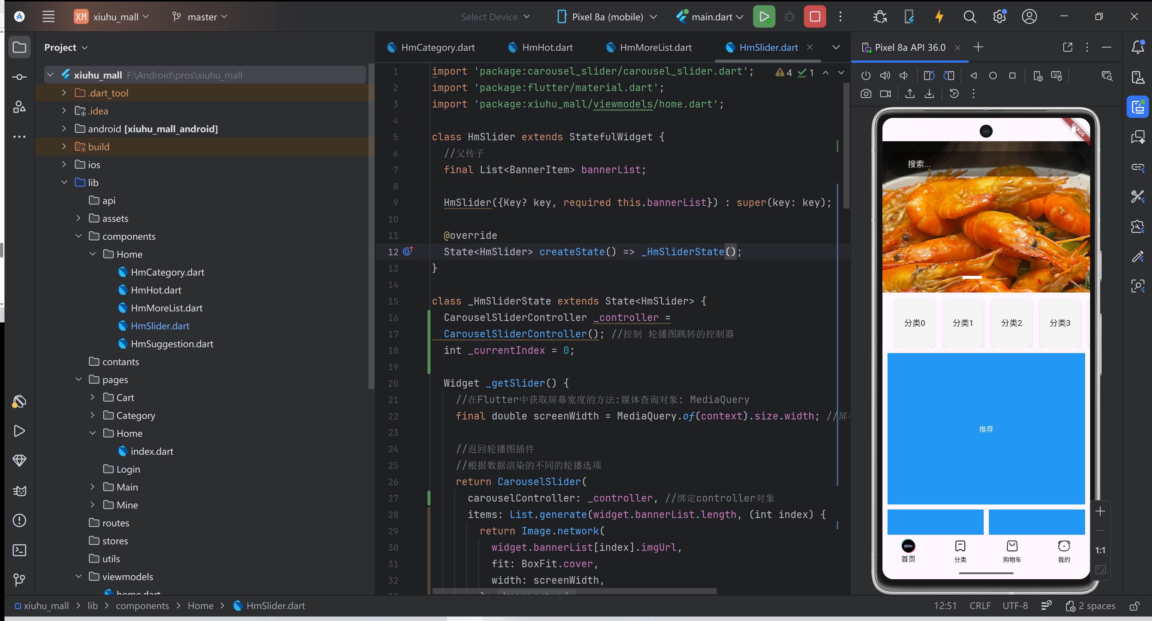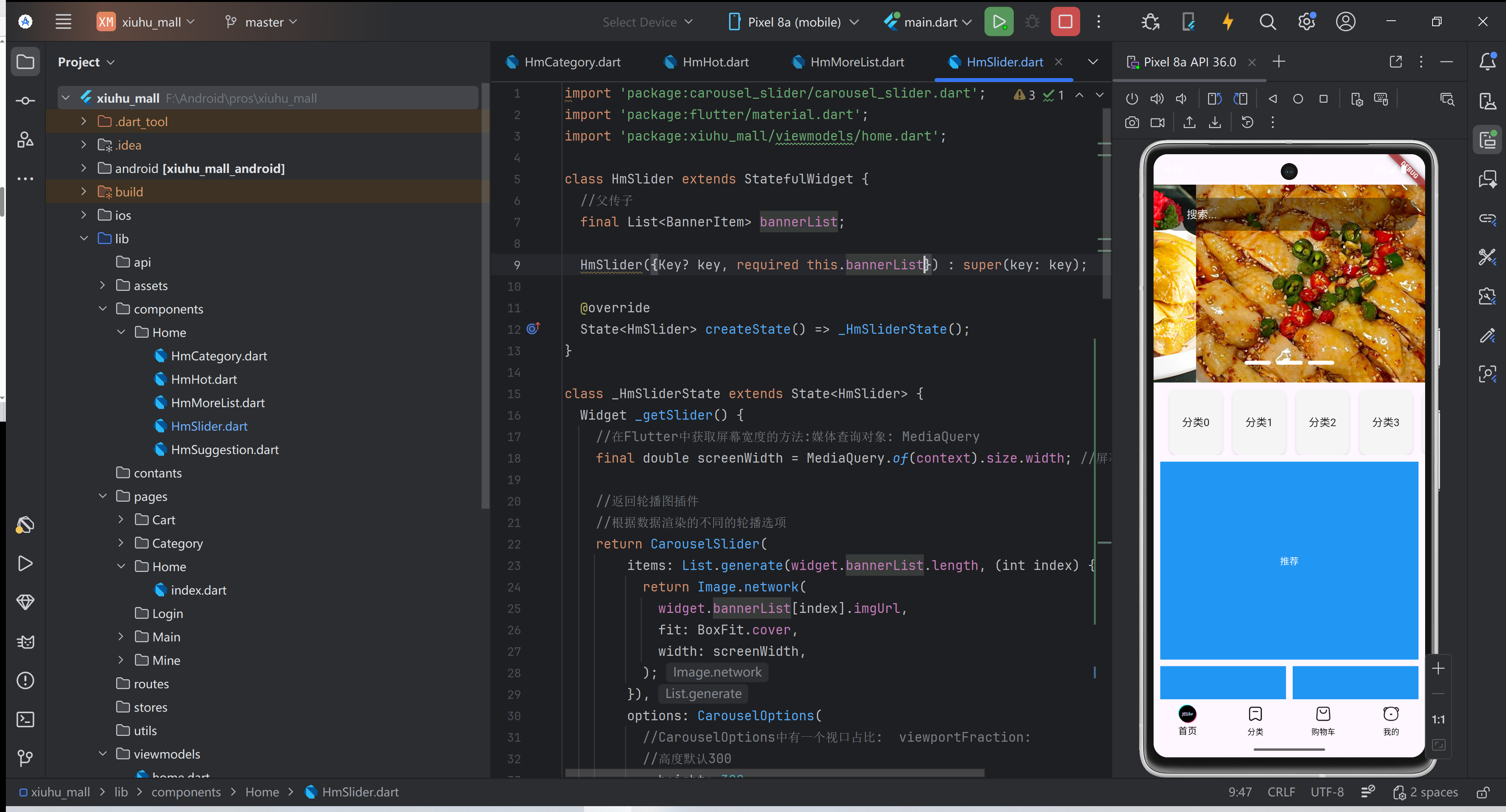 修改lib/components/Home/HmSlider.dart文件,新增控制器、绑定控制器并实现点击交互,完整代码如下: