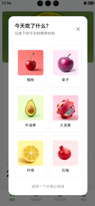 这是一个底部弹出的水果选择对话框,用户可以选择今天吃了什么水果。