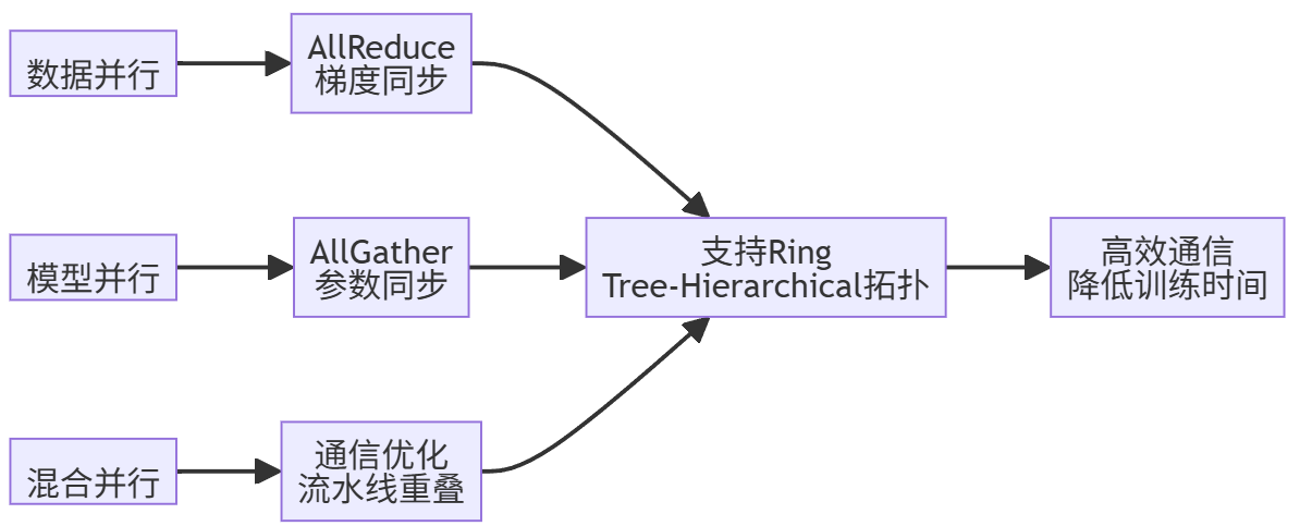 - 通信算子:AllReduce、AllGather、Broadcast等分布式训练必备原语