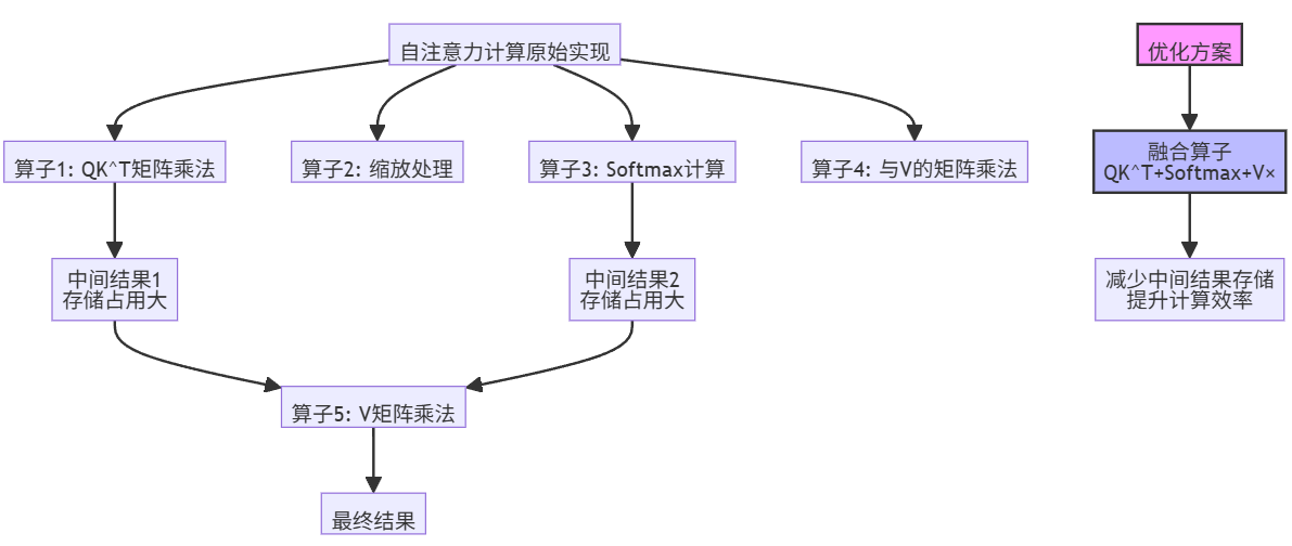 - 融合计算:将矩阵乘法、缩放、softmax和与V的矩阵乘法融合为一个单一算子