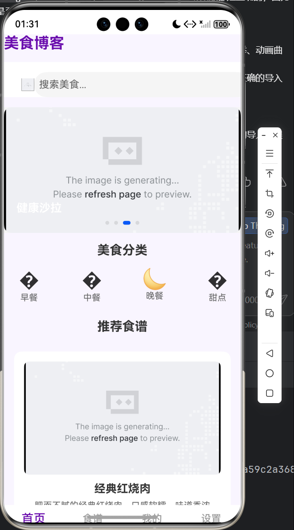 - 文字完全隐藏 / 缺失:仅渲染图标,首页、食谱、我的、设置文字被裁切、透明度失效或高度不足被挤压;