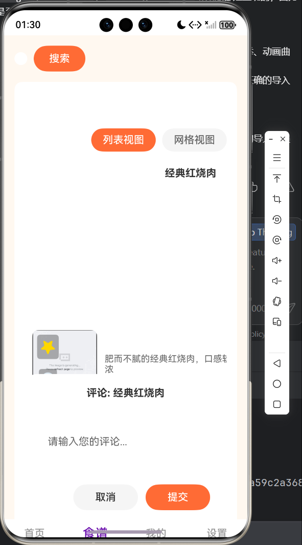 组件动效覆盖应用内所有核心交互单元,包括按钮点击反馈、食谱卡片入场、评论弹窗弹入 / 收起、收藏图标状态切换,动效时长统一控制在 100-200ms,保持视觉风格统一。