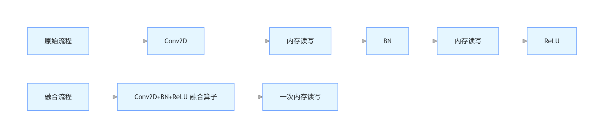 将多个连续的算子(如Conv2D + BN + ReLU)融合为一个复合算子,减少数据在内存中的读写次数。融合前后的流程对比: