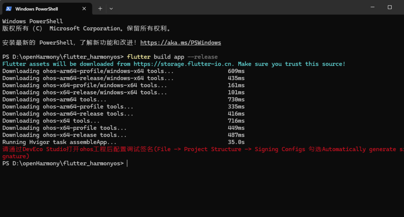 - 若使用 OpenHarmony 相关插件,检查 Hvigor 版本是否与 Flutter/OHPM 版本匹配;