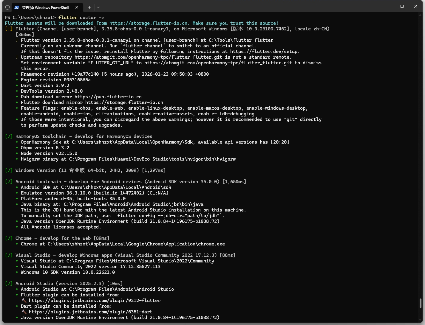 如果你看到 [✓] HarmonyOS toolchain 这一行变为绿色,恭喜你,最难的一关已经过了!