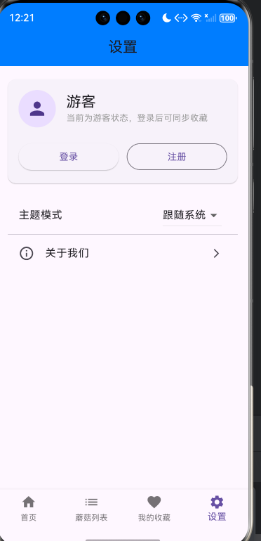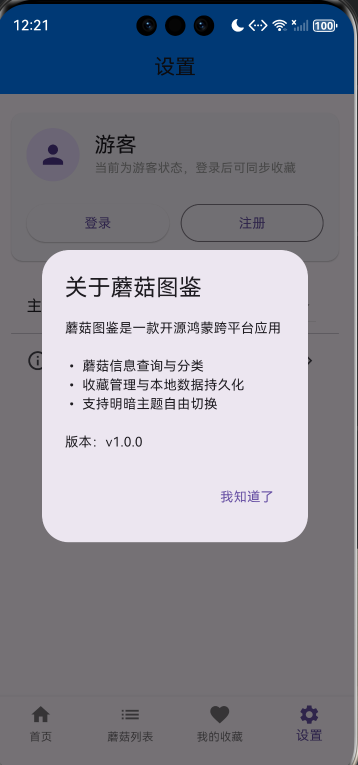 SnackBar反馈操作结果(登录成功提示 “登录成功,收藏已同步”,注册提示 “注册功能开发中,敬请期待”) - 新增「关于我们」入口,点击弹出应用介绍弹窗,包含应用定位、核心功能及版本信息