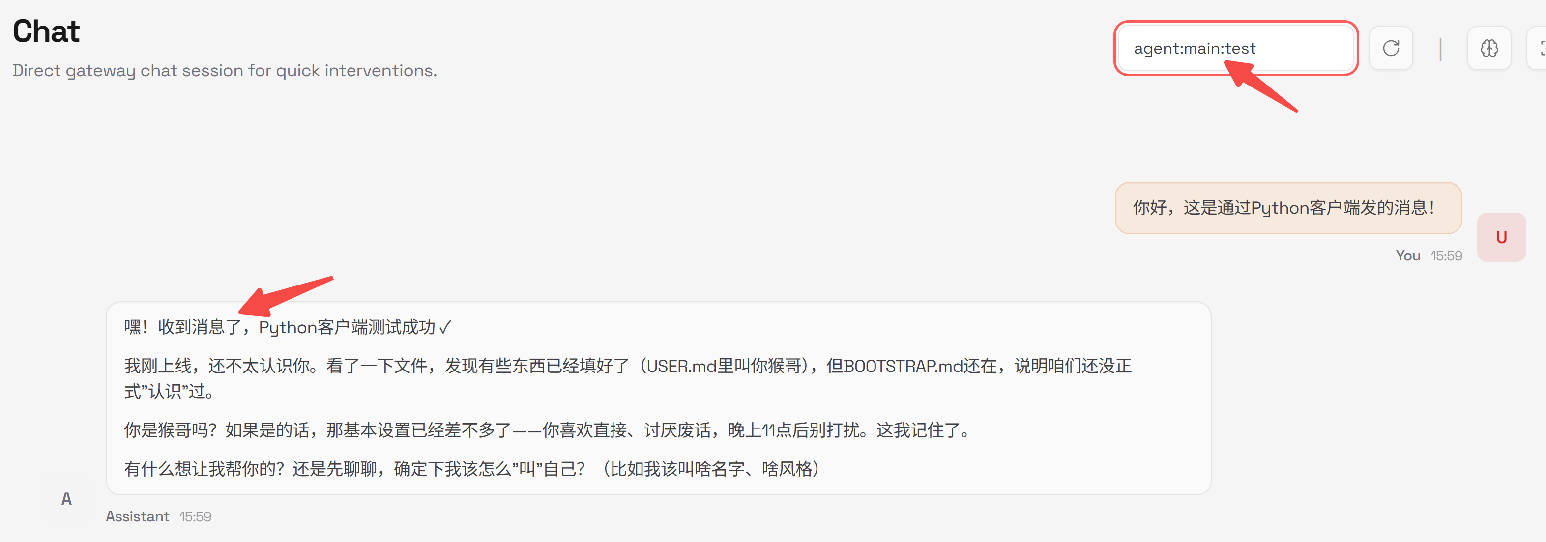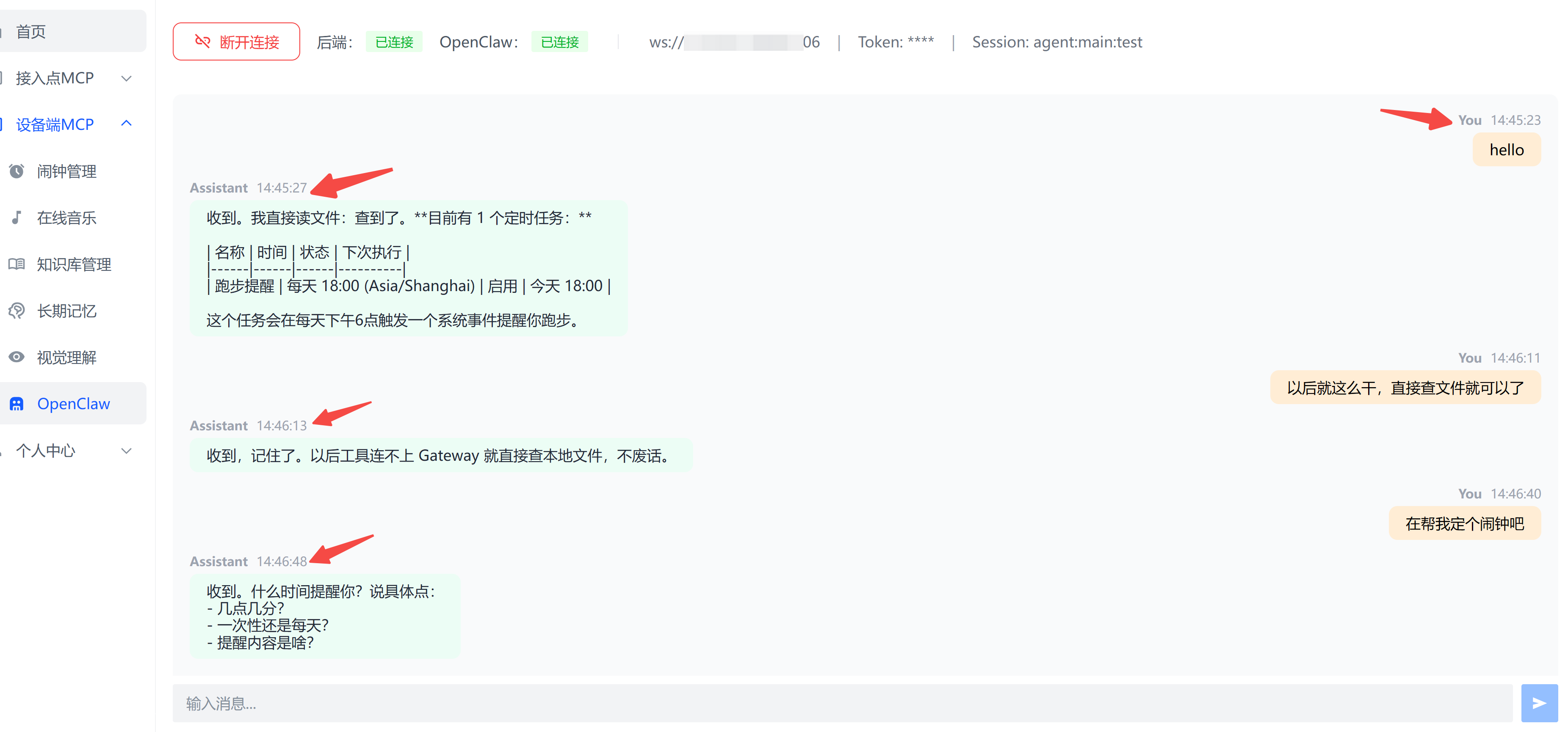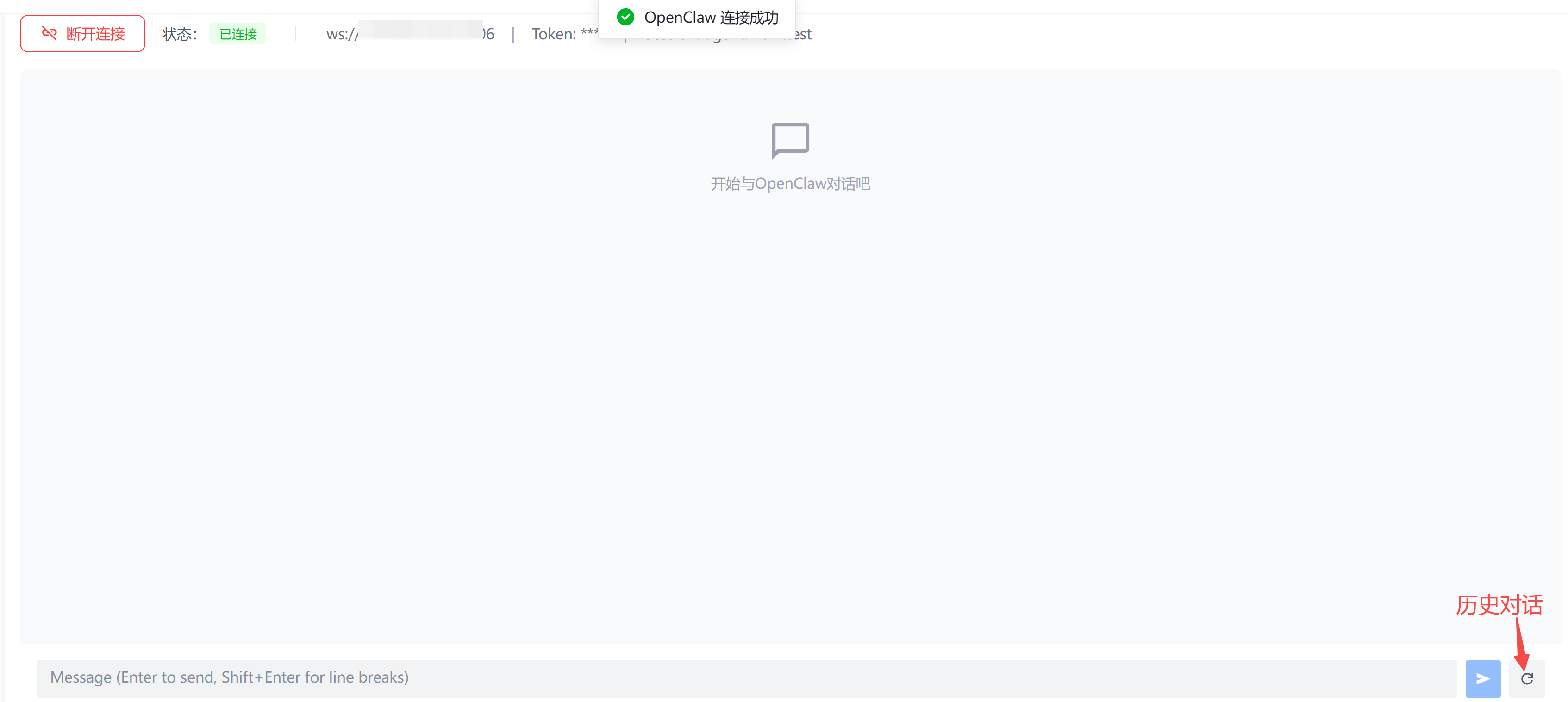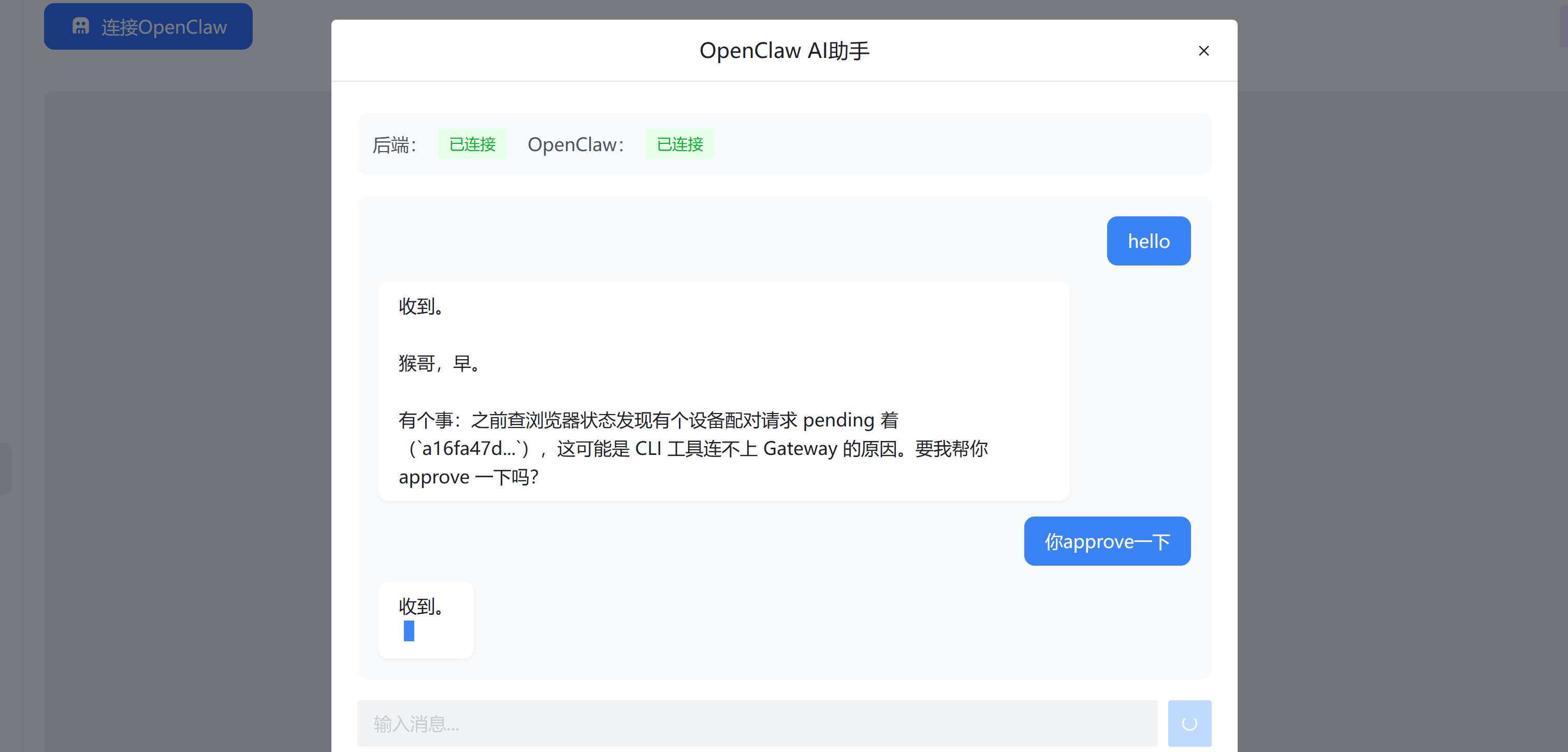 前端连接成功后,可以尝试给openclaw发一条消息: