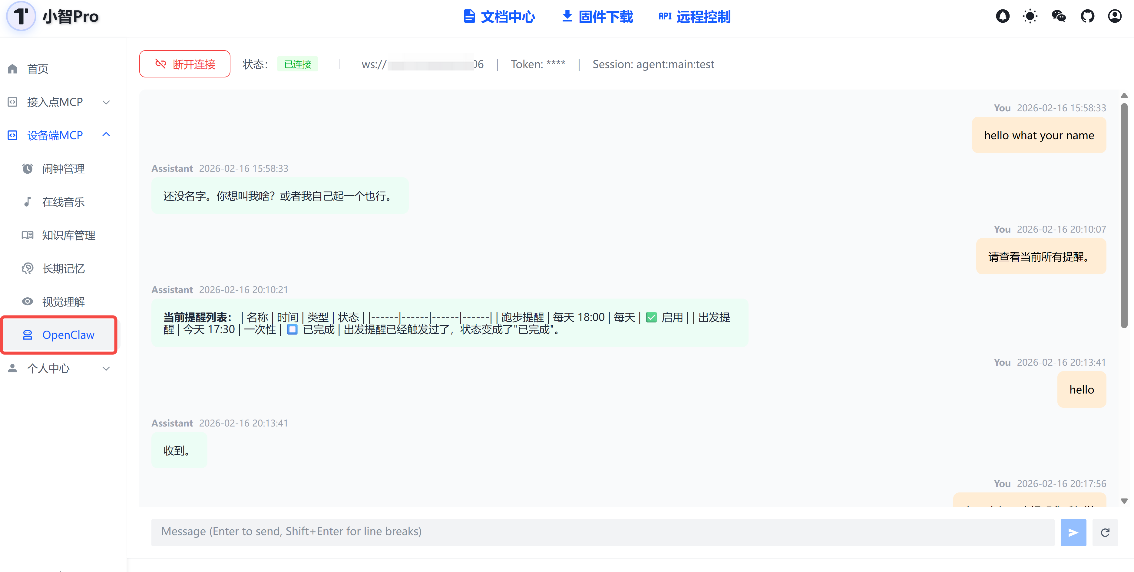 以上,小智Pro 已打通和openclaw的通信。