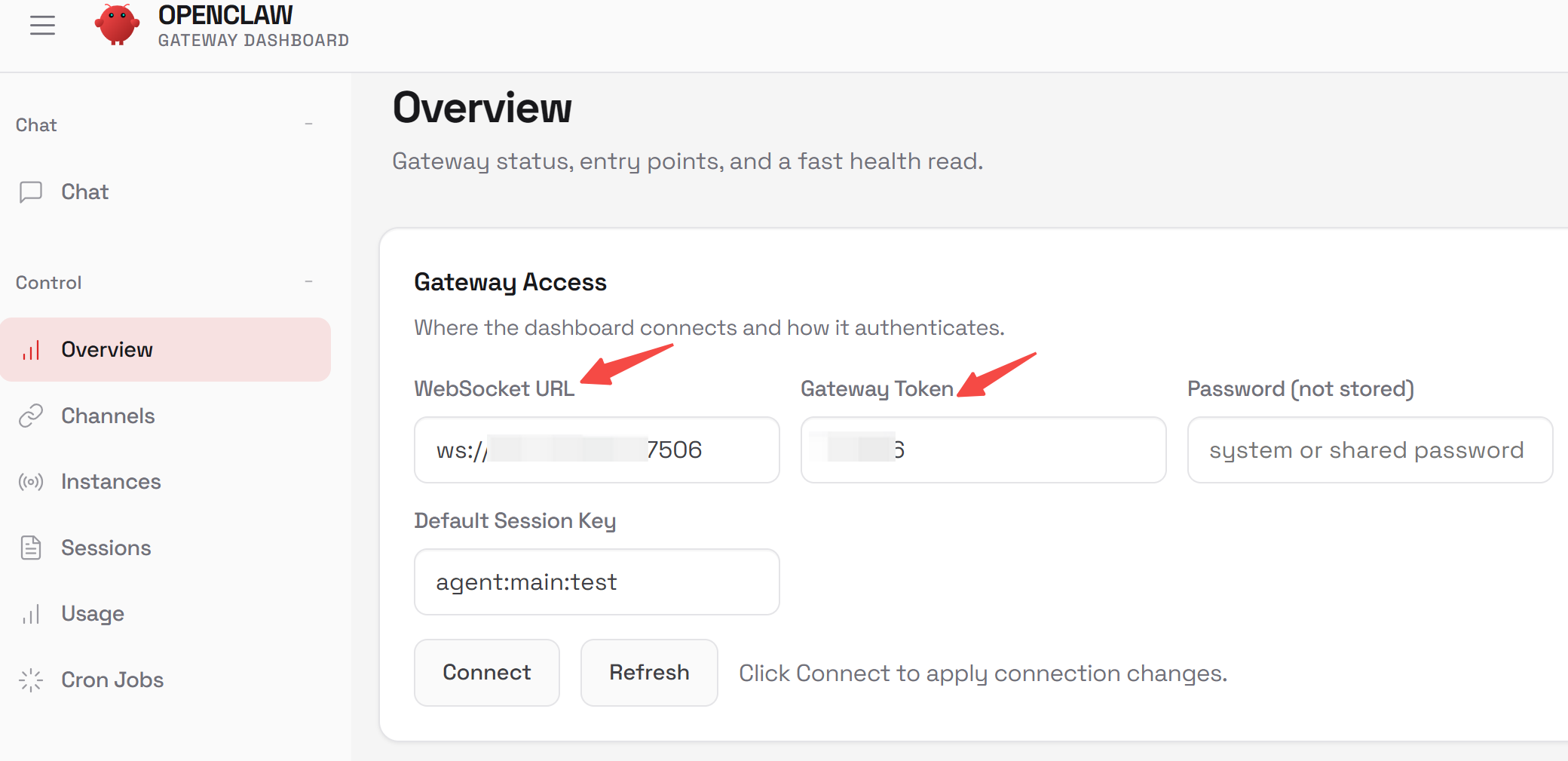 首先,在 openclaw 控制台获取你公网可访问的 Gateway URL 和用于鉴权的 Token。