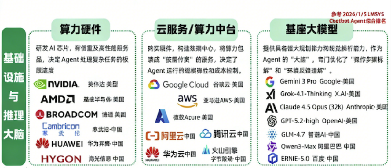 国际阵营:OpenAI的GPT-5.2-high、Google的Gemini3 Pro以及xAI的Grok-4.1-Thinking等构成了国际领先的大模型矩阵。它们提供了强大的规划能力和图文解析能力,是智能体处理复杂任务的基础。