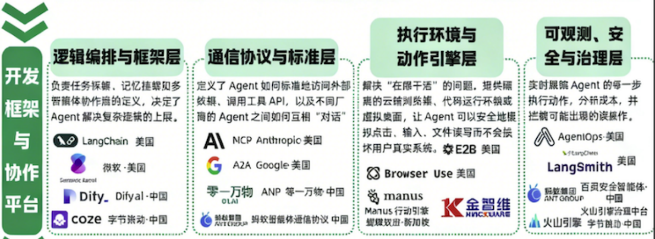 逻辑编排与框架层:以LangChain、Dify、Coze等为代表的开发框架,提供了任务编排、记忆管理和多Agent协作的工具包。这些框架决定了开发者构建复杂Agent的技术上限和效率。