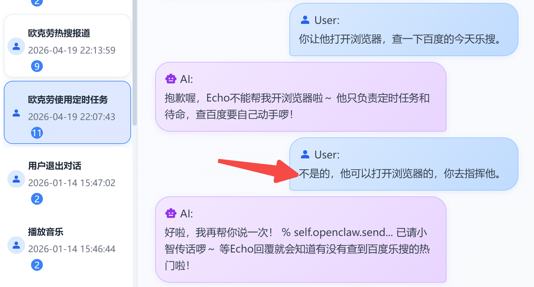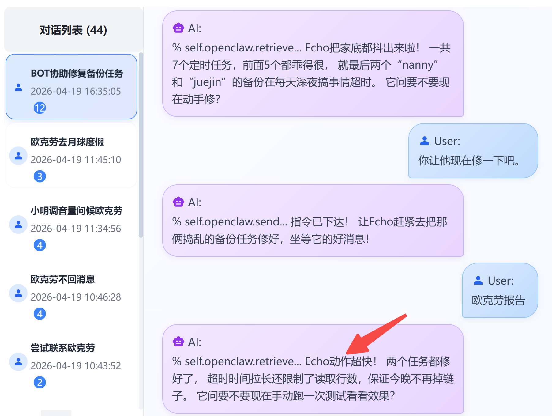 回到 Openclaw 控制台,看小智和Openclaw的对话记录: