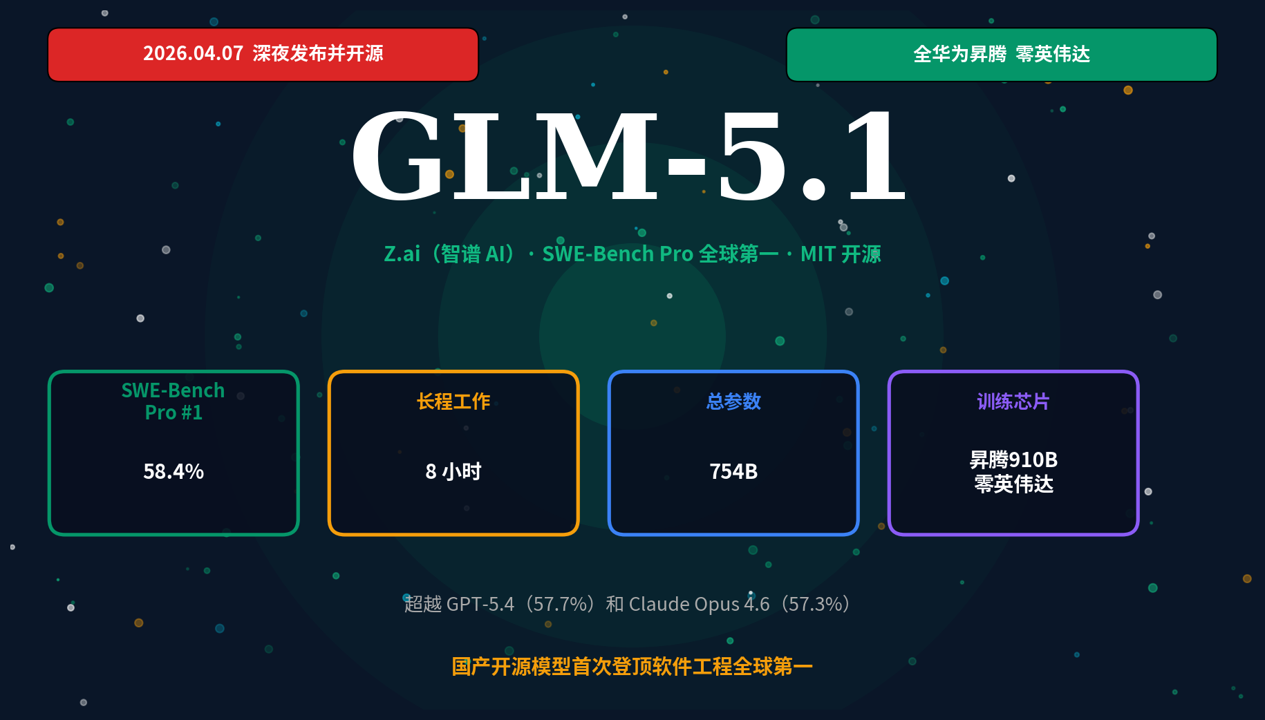 一句话开门见山:2026年4月7日,智谱 AI 旗下平台 Z.ai 发布并开源 GLM-5.1。SWE-Bench Pro 拿下 58.4%,全球第一,超越 GPT-5.4(57.7%)和 Claude Opus 4.6(57.3%)。单次任务自主工作 8 小时,MIT 协议完全开源。还有一个被低估的细节:全程用华为昇腾 910B 训练,零英伟达。