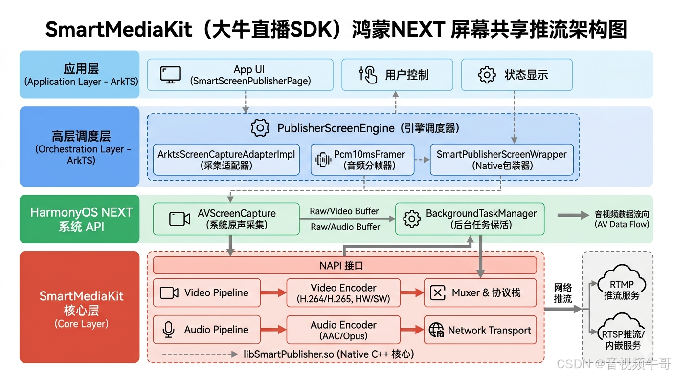 本文将深度复盘大牛直播 SDK(SmartMediaKit) 在鸿蒙 NEXT 端的同屏推流(屏幕共享)实现架构,重点探讨如何利用 ArkTS 高层封装实现工业级的稳定推流。