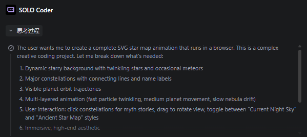 第一轮测试,小雷让它写一个可以互动的网页版星空,要求是可以点击星星看故事,还能用鼠标拖拽视角。
