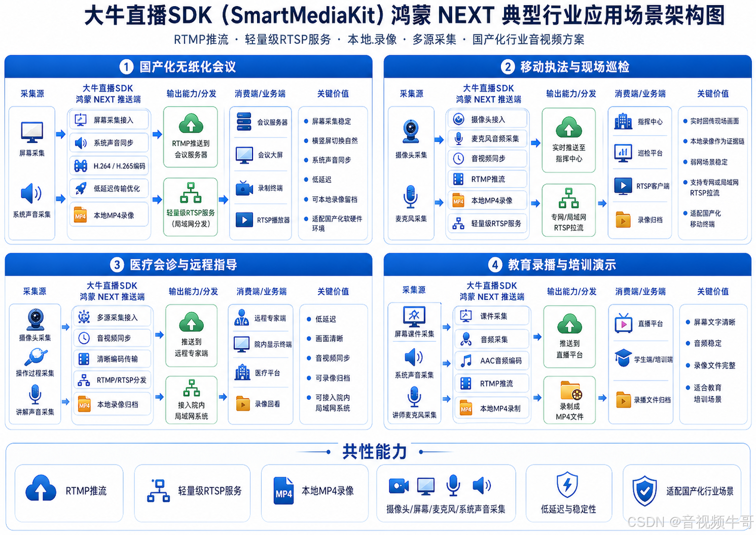 这类能力非常适合用于鸿蒙 NEXT 设备上的实时音视频采集、远程协作、国产化会议系统、移动执法、巡检终端、医疗会诊、教育录播、工业现场可视化等场景。