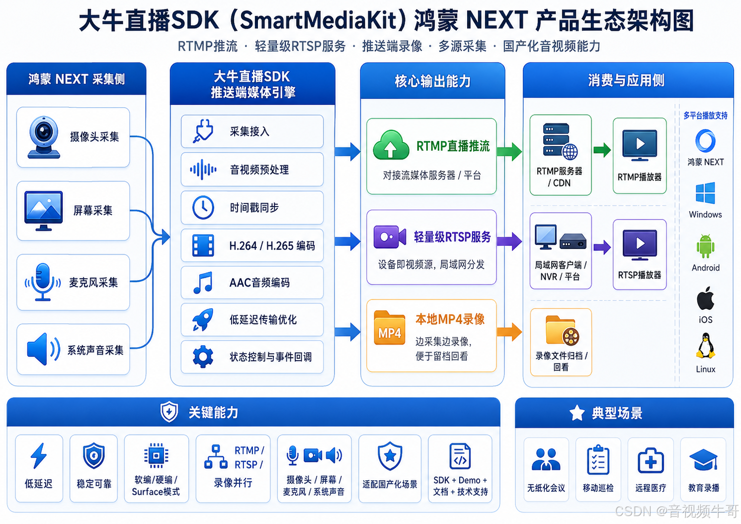 大牛直播SDK(SmartMediaKit)在鸿蒙 NEXT 下持续补齐 RTMP 推流、RTSP/RTMP 播放、轻量级 RTSP 服务、录像、屏幕采集、摄像头采集、麦克风和系统声音采集等能力,本质上是在为国产化实时音视频场景提供一套更完整的基础能力。